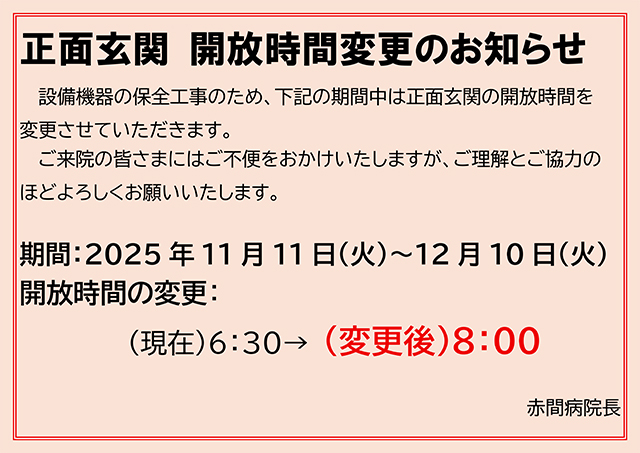 Information「正面玄関 開放時間変更のお知らせ」掲載