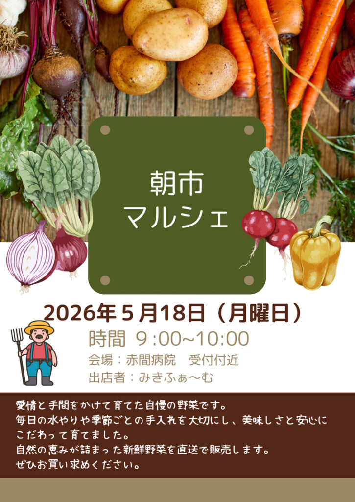 Information「5月18日(月)赤間病院受付付近にて朝市マルシェ開催します」掲載